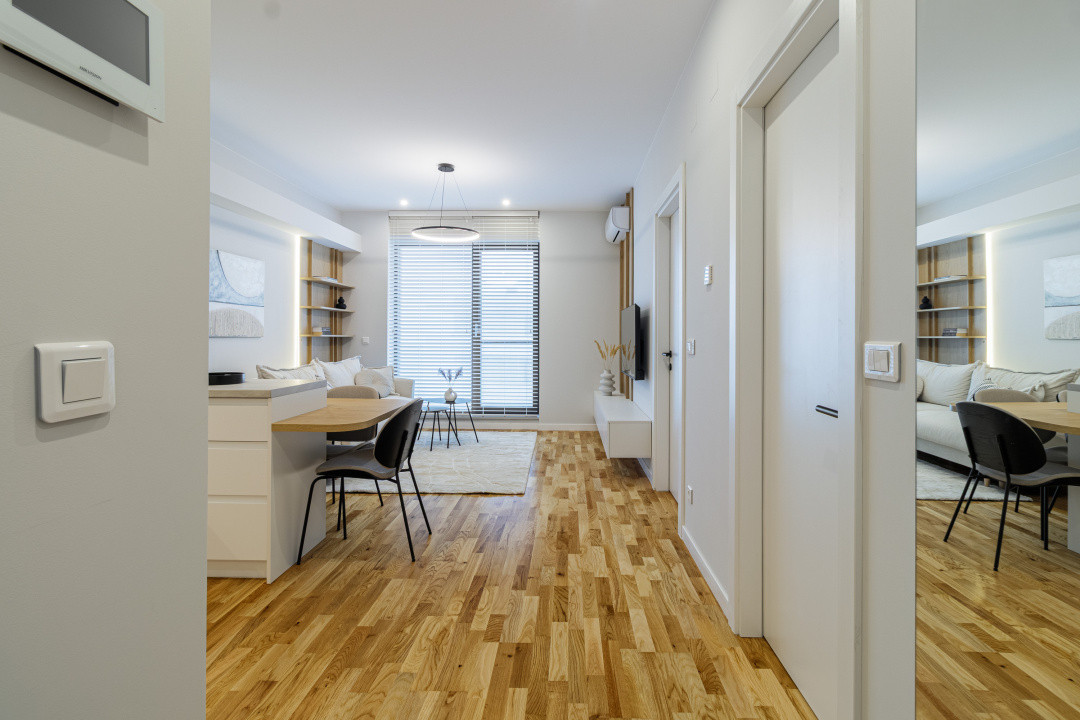 Amenajarea a pornit de la ideea de calm si echilibru si a prins forma in stil japandi – o combinatie intre naturaletea si serenitatea stilului japonez si functionalitatea minimalista scandinava. Culori naturale, texturi calde, linii curate, lumina blanda – totul este ales astfel incat, atunci cand ajungi acasa, sa te deconectezi de la zgomotul orasului. Este un spatiu elegant in care te vei simti in armonie.