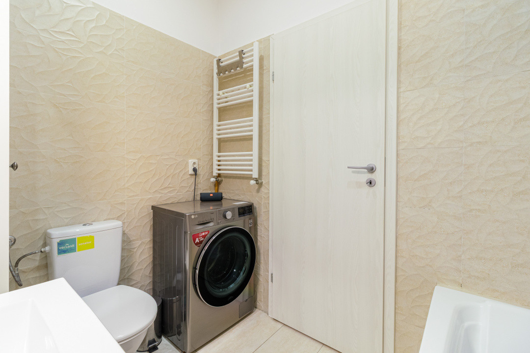 Continuând, avem dormitorul complet mobilat și utilat, iar nu în ultimul rând baia, dotată cu cadă, aerisire prin ventilație și mașină de spălat rufe.