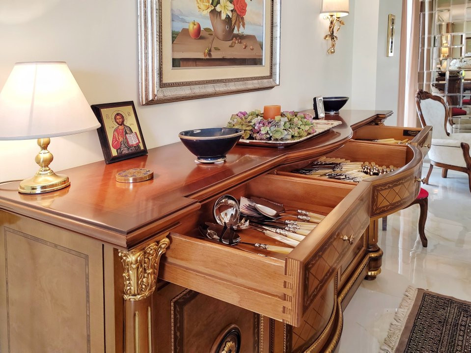 În completarea amenajării se află piese de artă și design cu adevărat rare – tablouri ale unor pictori renumiți (Giusti, Pinetto Gobbi), un bufet Marzorati seria “Senator” cu tacâmuri Casa Bugatti, sau un set exclusiv de opt scaune de anticariat, stil clasic englezesc. Acestea pot deveni parte din tranzacție, în urma unei negocieri separate. Sunt elemente care nu doar decorează, ci conferă proprietății un aer unic, greu de replicat.