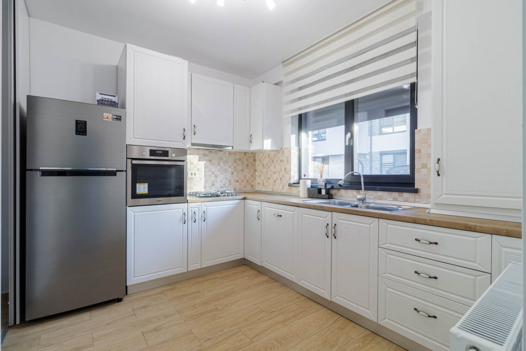 Bucătărie complet mobilată și utilată – frigider, mașină de spălat vase, cuptor electric, aragaz, centrală termică