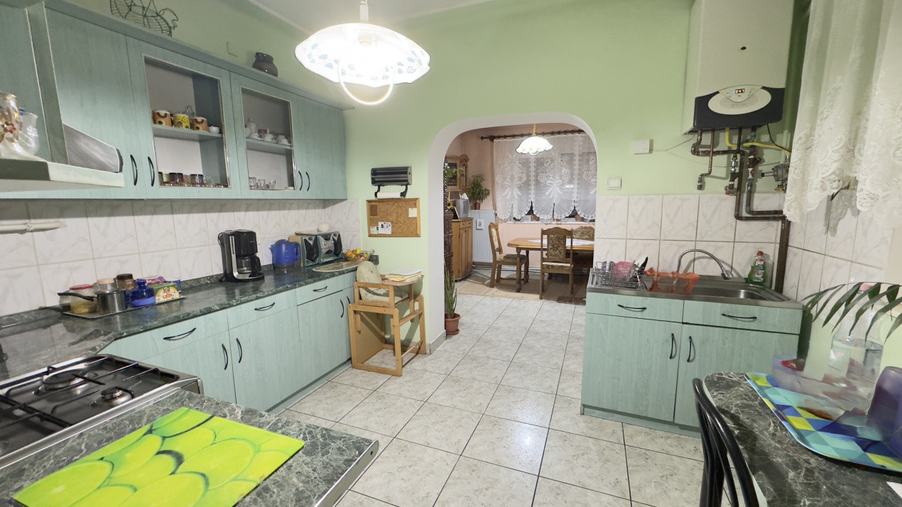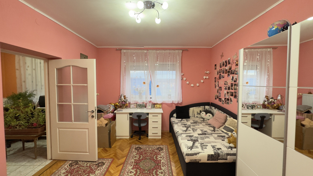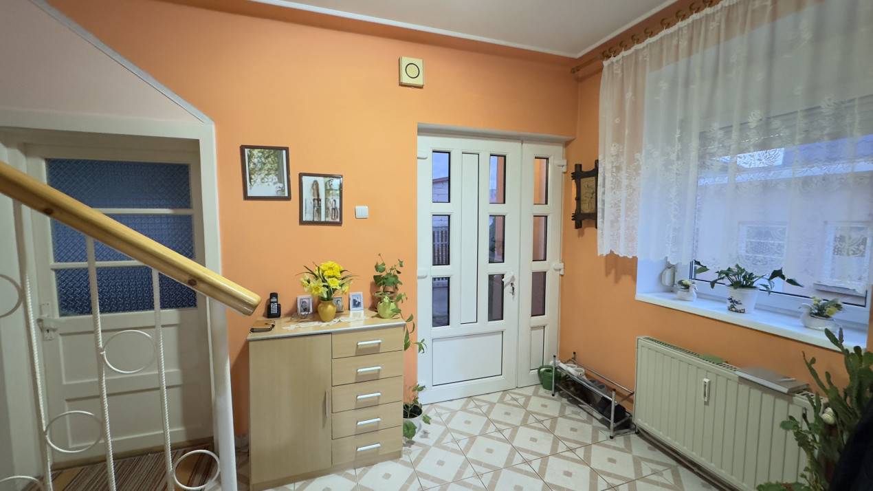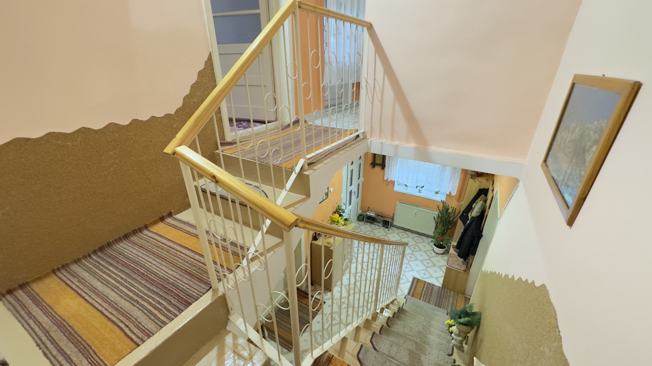 Casă solidă cu fundație din piatră de munte și beton, structura pereților din cărămidă, acoperișul cu țigla ceramică, este împărțită pe 2 nivele P+1 cu acces la etaj prin casa scării fiind dotată cu incălzire centralizată cu centrală pe gaz cu calorifere, tâmplarie PVC cu geamuri termopan și rulouri exterioare PVC, uși interioare din lemn și celulare, parchet din lemn masiv, ușă intrare din PVC și este racordată la gaz, apa de oraș, canalizare, curent electric și este compusă din următoarele: