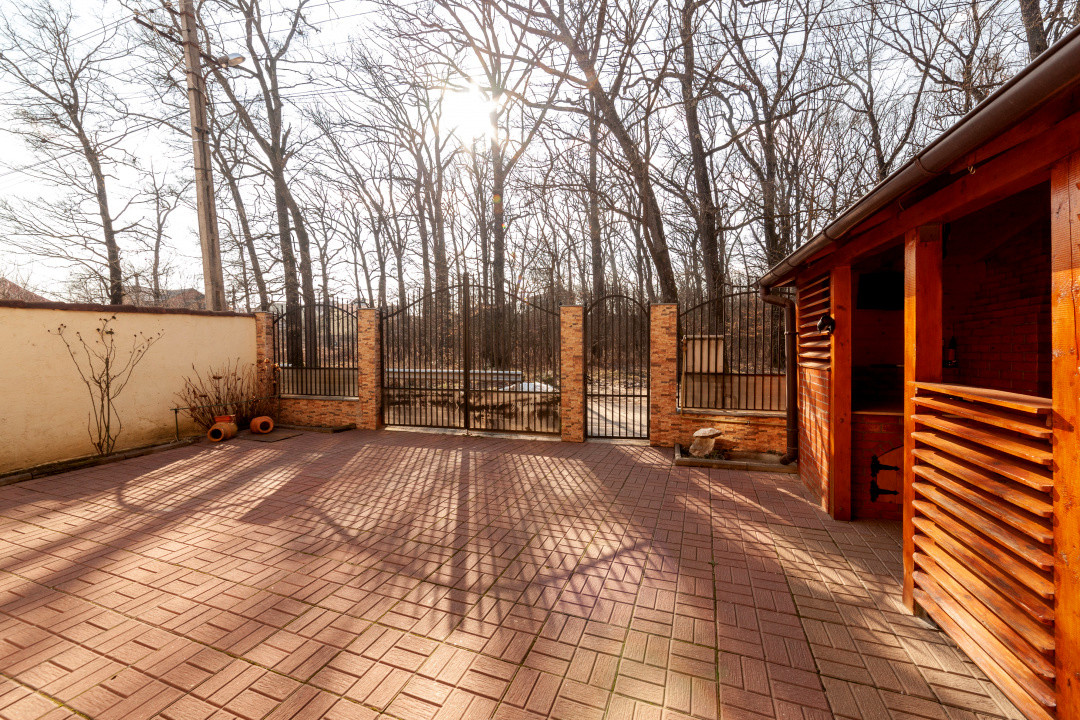 În curte ai un foișor acoperit, cu grătar din cărămidă și zonă de luat masa — perfect pentru seri liniștite cu familia sau prietenii.