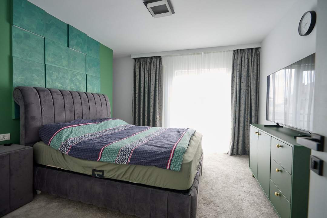 Dormitorul matrimonial elegant, evidențiat de un perete decorativ statement în nuanțe sofisticate de verde, este inundat de lumină naturală din plin. Cu dressing si baie proprii, ofera un spațiu personal privat, relaxant si odihnitor.