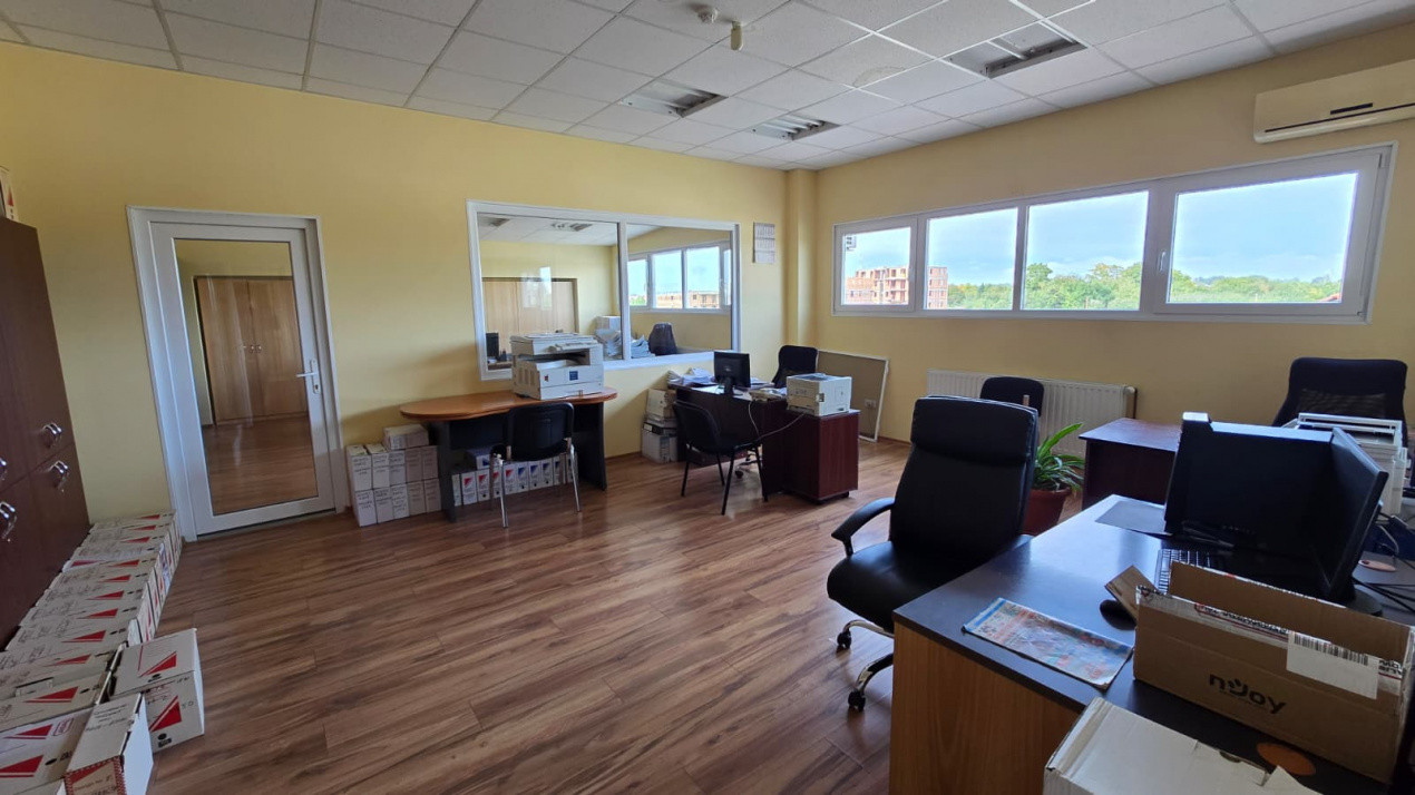 Mult spațiu, multă lumină, birourile separate cu pereți de sticlă oferă un confort ideal pentru a desfășura activitatea.