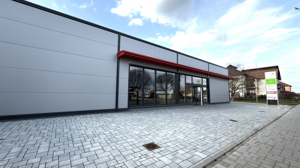 Clădirea din panouri sandwich construită in 2025 este dotată cu vitrine generoase din PVC cu geamuri termopan de aproximativ 35 mp pe 2 fronturi stradale unul de 23m iar al doilea de 13m.