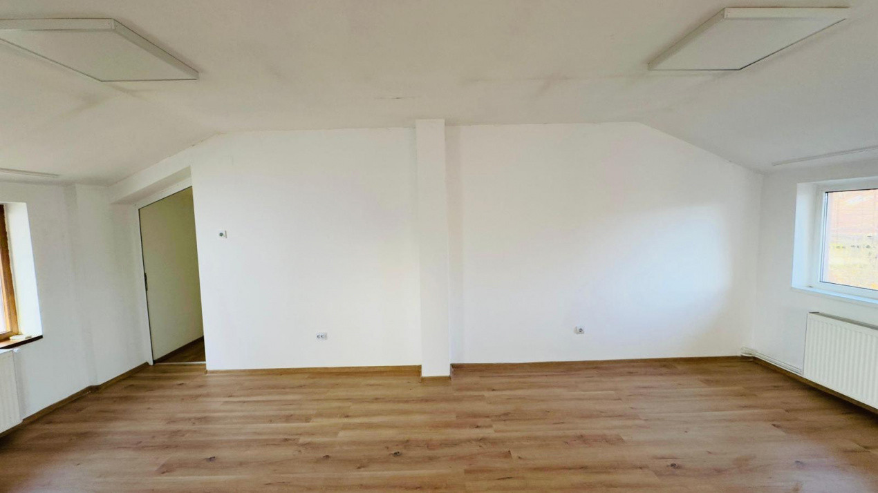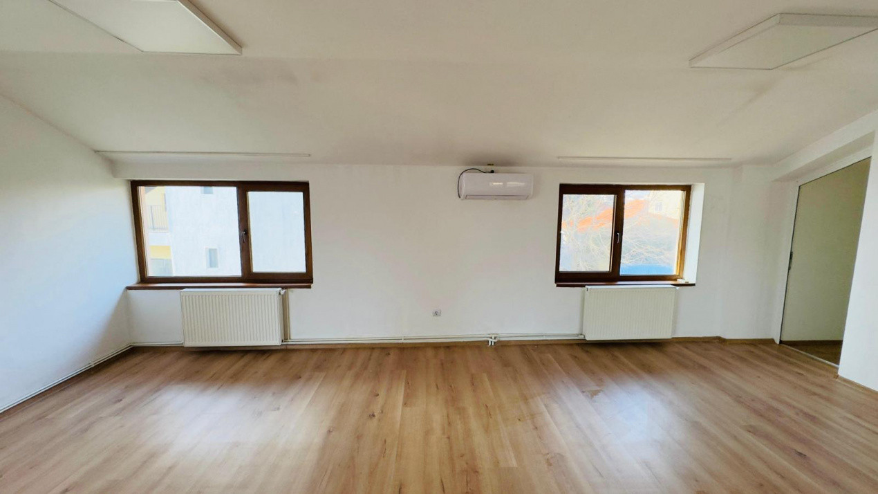 Spatiul are o suprafata utila de 121,1 mp, o suprafata totala de 125,9 mp, este compartimentat eficient in 2 camere, vestiar, 2 grupuri sanitare, 2 holuri și beneficiaza de intrare separată. Este renovat modern, fiind foarte spatios si luminos, ideal pentru diverse activitati comerciale sau de birou.