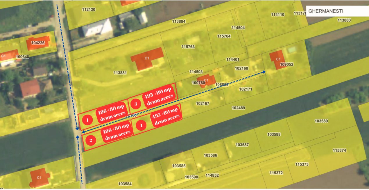 Va propunem spre vânzare patru terenuri intravilane pentru construcție, situate în Ghermănești, pe strada Plevnei, la 40 de minute de București. Cele patru loturi sunt alăturate, două pe o parte și două pe cealaltă parte a drumului de acces privat (fiecare cu cota parte de 80 mp), ceea ce le face ideale pentru familiile care vor să fie aproape unii de alții sau pentru cei care își doresc să investească într-o mică dezvoltare rezidențială.